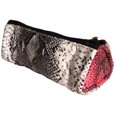 Ett praktisk pennfodral som rymmer många pennor och suddgummi, den har en trekantig form med en ormskinns textur med mjuk yta som går i vitt och svart. Perfekt att ha i ryggsäcken så slipper man ha alla pennor utspridda eller i sitt skåp i skolan för att ha ordning på allt.
